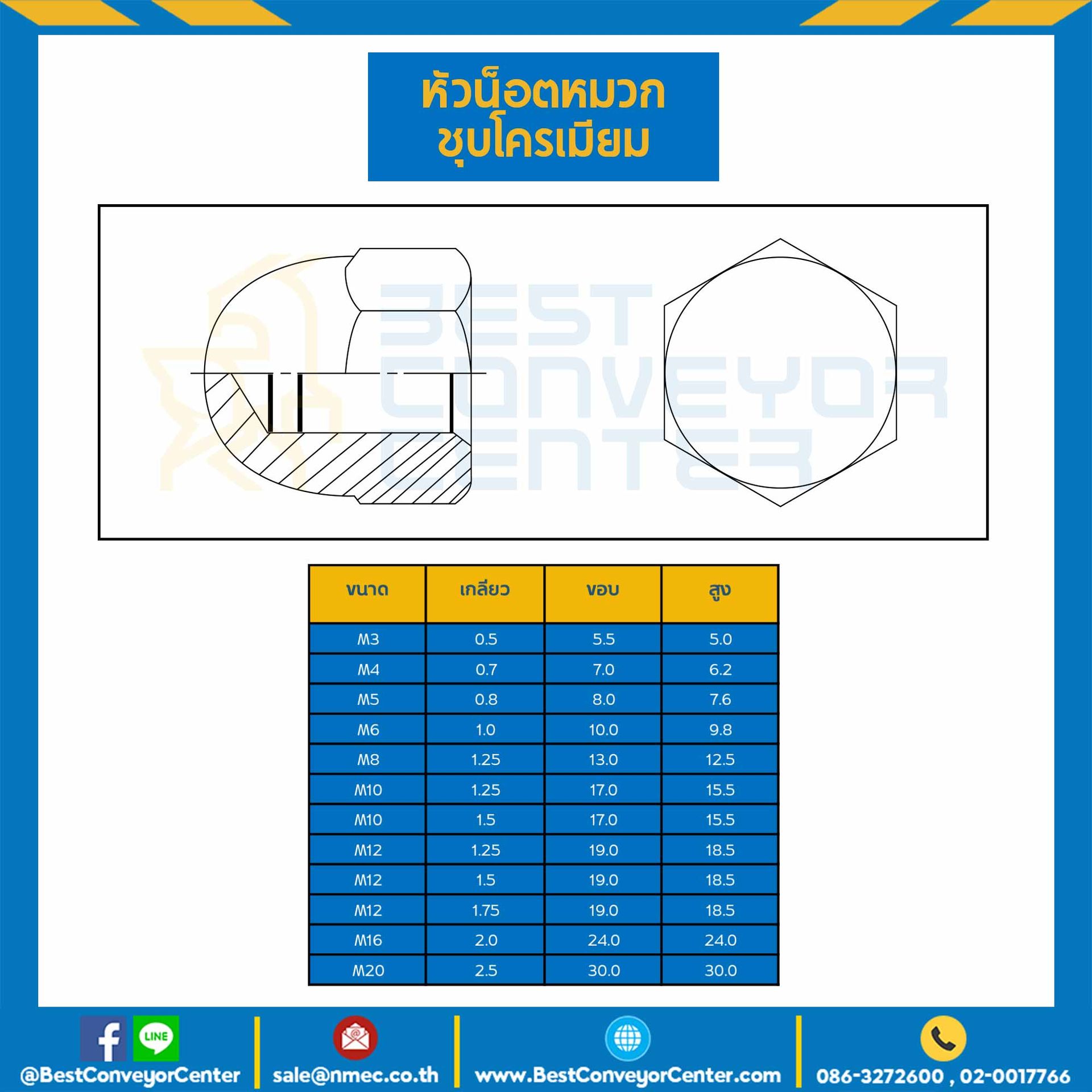 หัวน็อตหมวกชุบโครเมียม ขนาด M20x2.5 ขอบ 30 สูง 30 mm. : CN-M20-2.5-CR