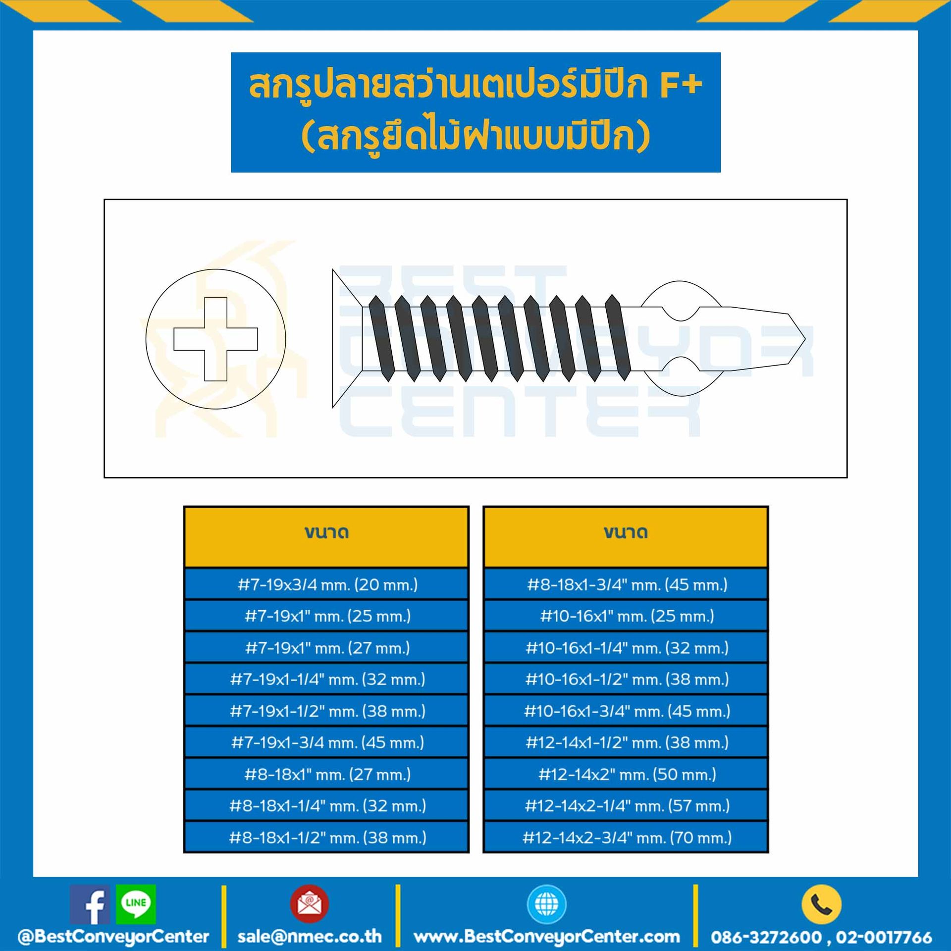 สกรูปลายสว่านเตเปอร์มีปีก F+ ชุบขาว ขนาด #7-19×3/4 mm. (20 mm.) : HSWC#7-19L3/4S-20