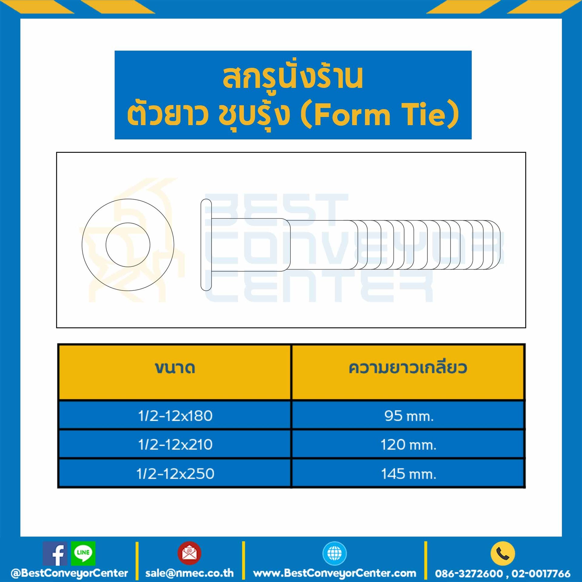 สกรูนั่งร้านตัวยาว ชุบรุ้ง ขนาด 1/2-12×250 ความยาวเกลียว 145 mm. : HSSF-250L145