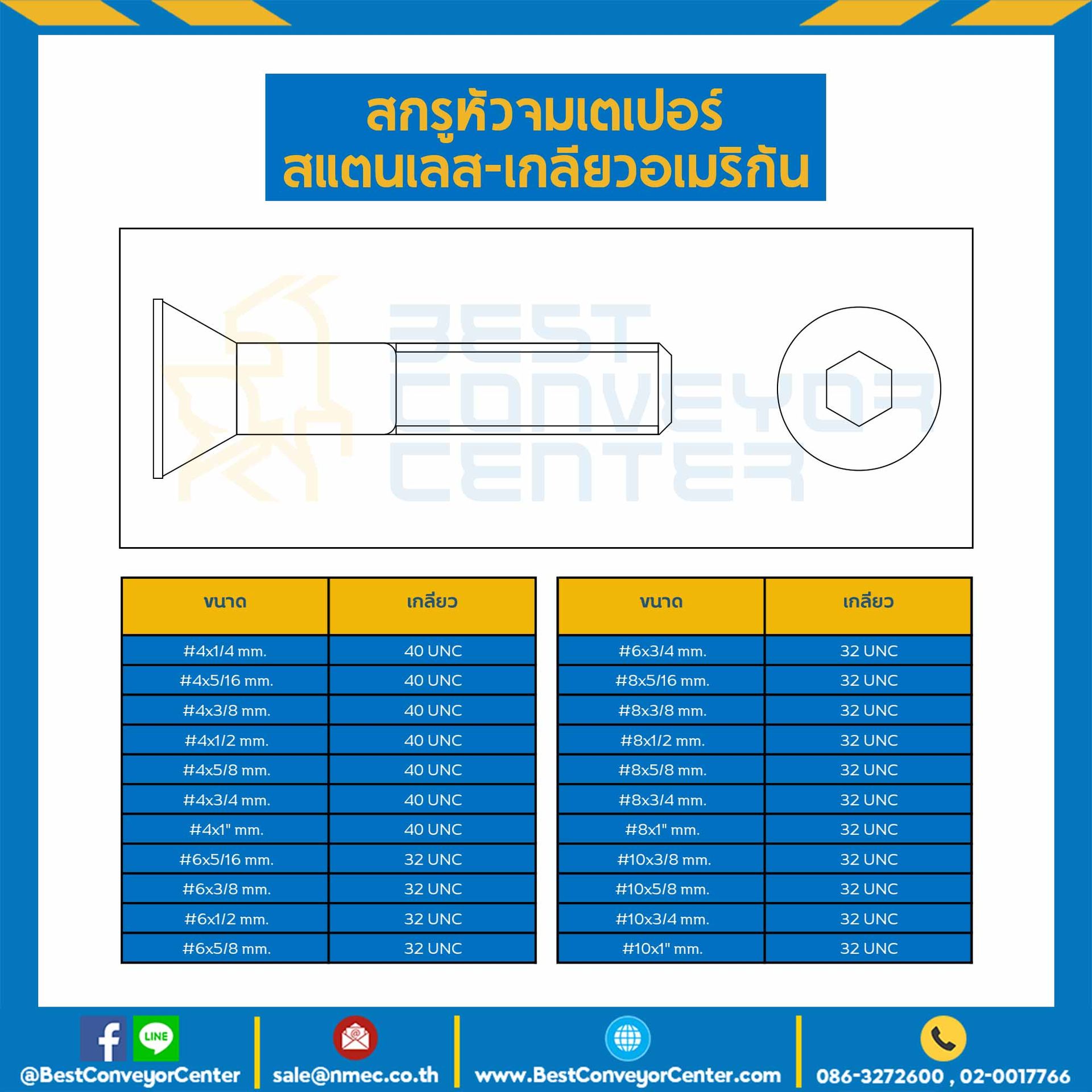 สกรูหัวจมเตเปอร์สแตนเลส ขนาด #10×1″ mm. เกลียว 32 UNC : HTP-A#10L25.4SS-UNC