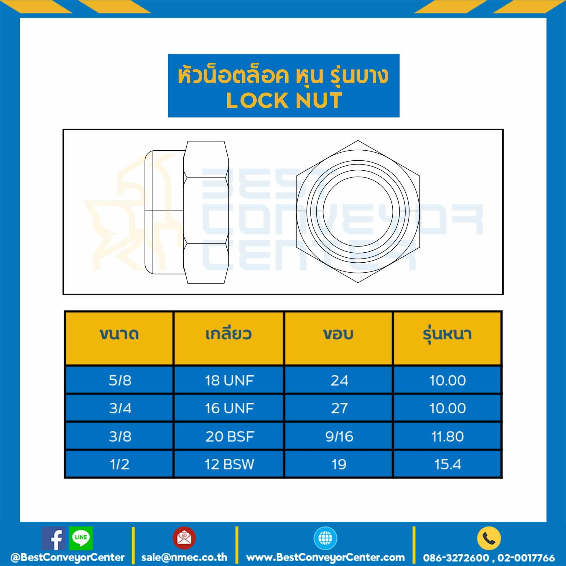 JLN-5/8-UNF : หัวน็อตล็อคหุน ขนาด 5/8″x18 UNF ขอบ 24 รุ่นบางพิเศษ 10 mm.
