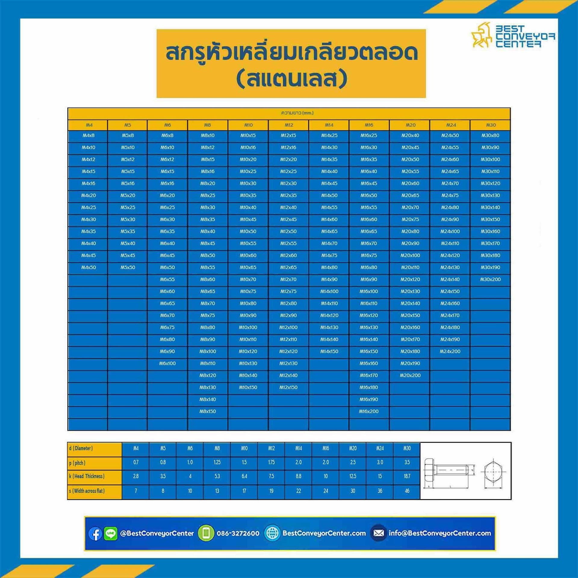 สกรูหัวเหลี่ยม M8x30 mm. เกลียวตลอด สแตนเลส : M8L30SS